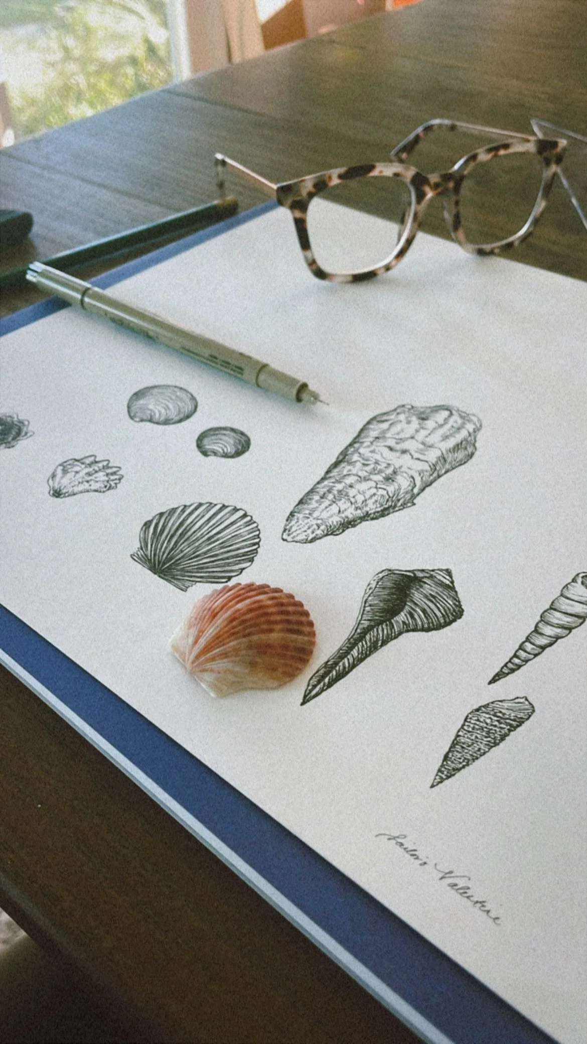 Drawing shells, coral, and barnacle I’ve collected through the years.
